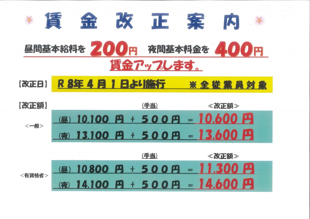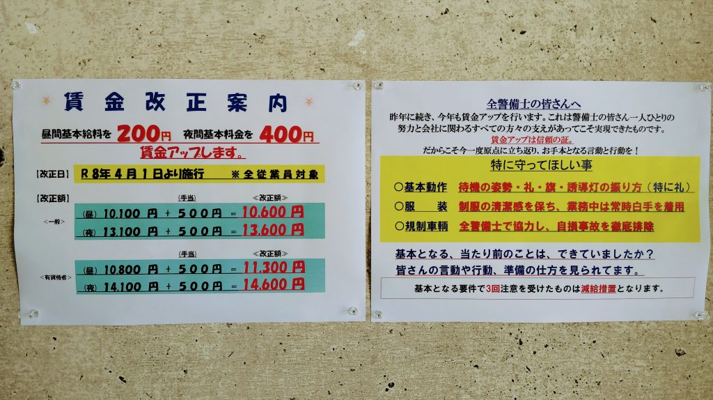 2026年4月1日より昨年に続き、賃金アップを行います。これもひとえに警備士の皆さん一人ひとりの努力と会社に関わるすべての方々の支えがあってこそ実現できたものです。心より感謝申し上げます。