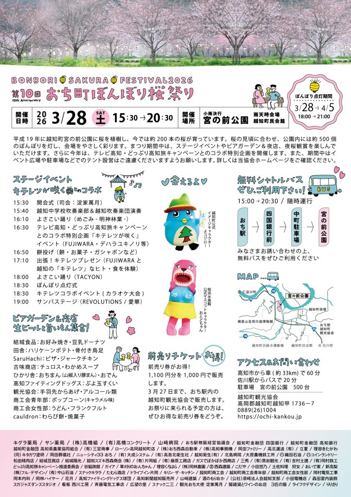 令和8年3月28日(土)、越知町宮の前公園で【第10回 おち町ぼんぼり桜祭り】が開催されます。