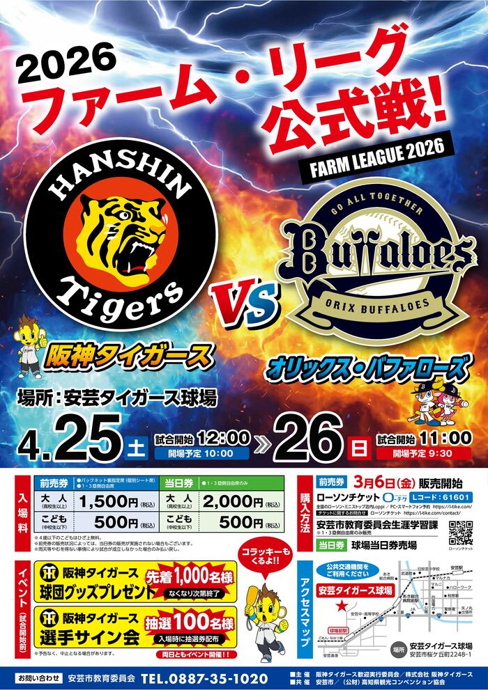 4/25(土)、26(日)の両日、安芸市の安芸タイガース球場(安芸市営球場)にてファーム・リーグ公式戦「阪神タイガースvsオリックス・バファローズ」が開催されます。一軍での活躍を目指して、躍動する両チームに熱いご声援をお願いします。