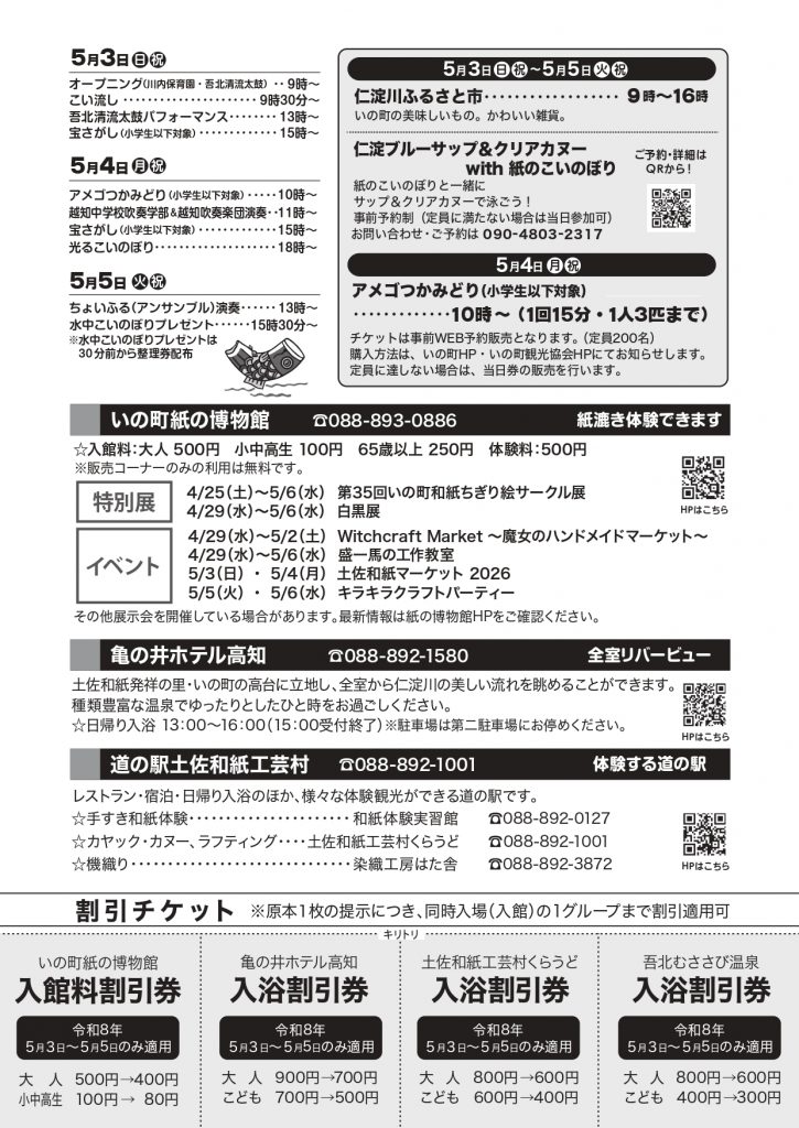 いの町の特産品の紙「不繊布」で作られた約200匹のこいのぼりが仁淀川を涼しげに泳ぎます。期間中の会場では、宝探しやアメゴ釣り大会、グルメや雑貨の販売、キャンドル作りやこいのぼり作りなどのワークショップなど様々なイベントを開催予定しています。